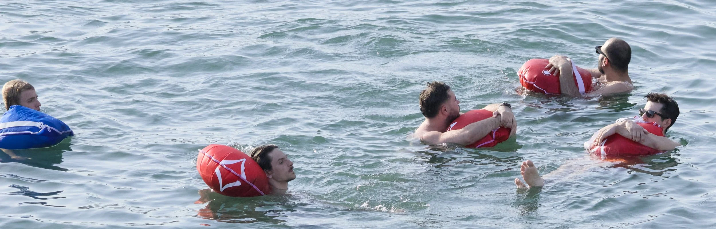 Four figures drift side by side, halos of color tethering them to the surfaceβadulthood shimmering just beneath the water as laughter and motion blur the boundary between memory and the present. Play pulses in the sunlight, unspoken yet bright, a quiet rebellion woven gently through ordinary grace.