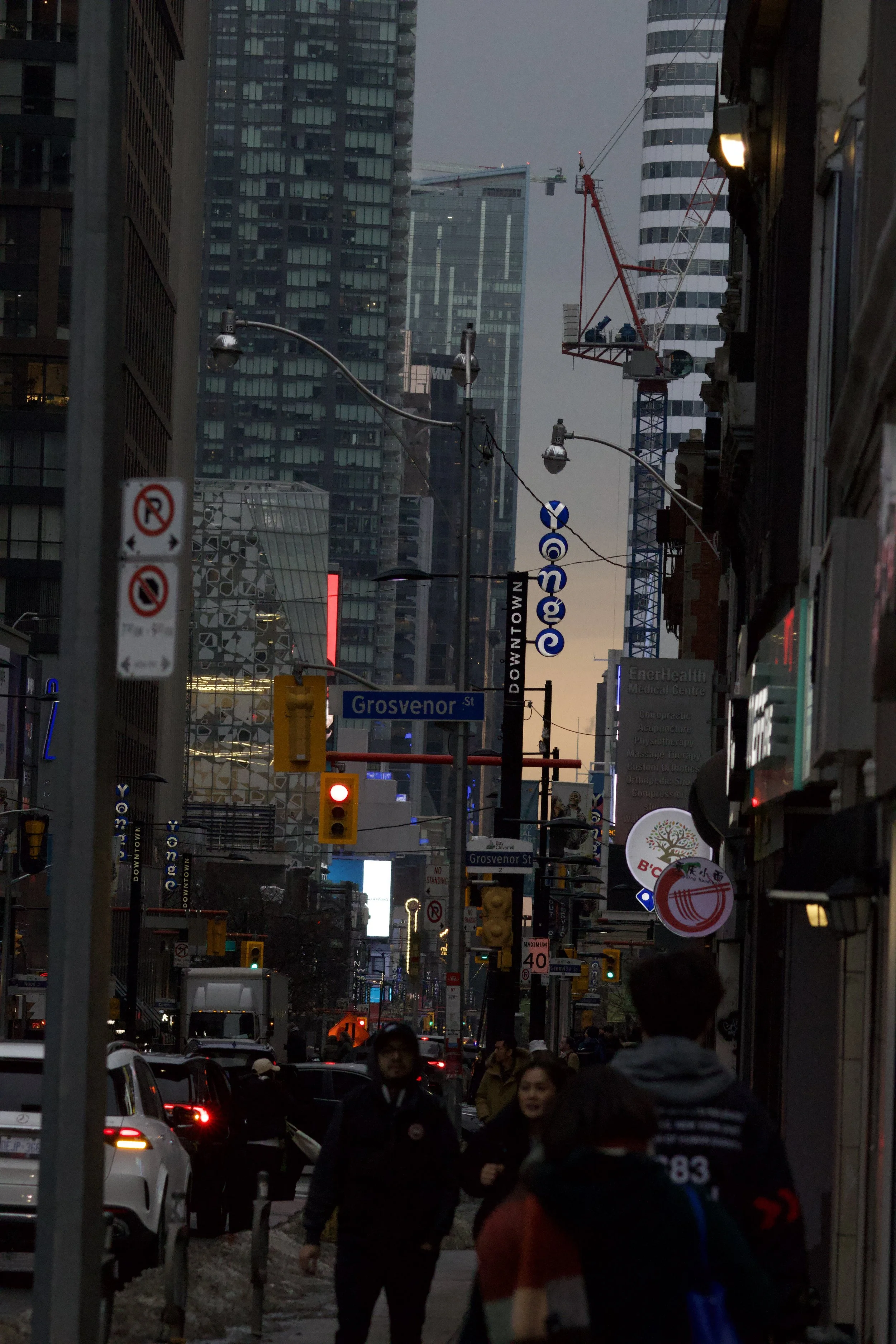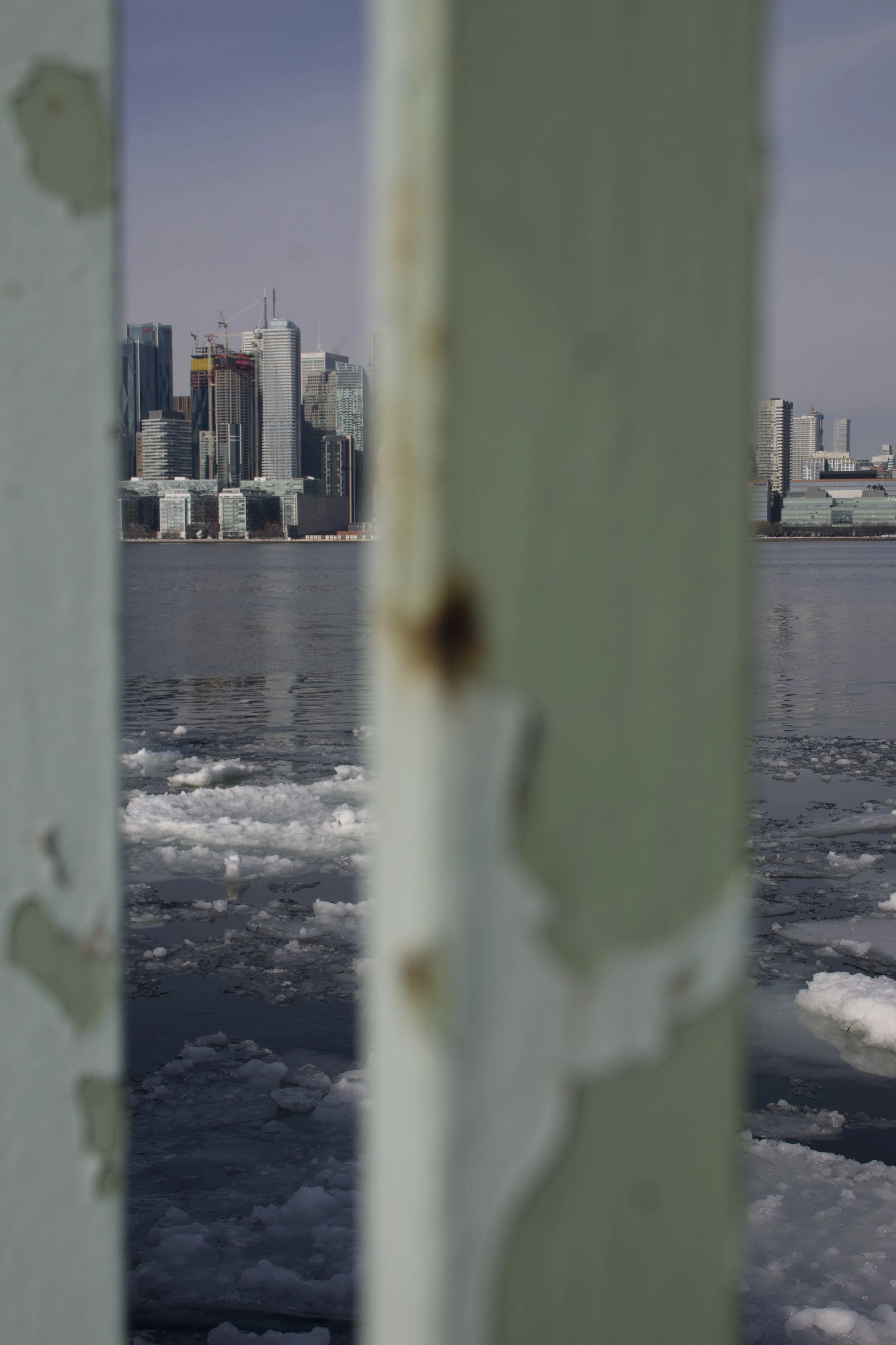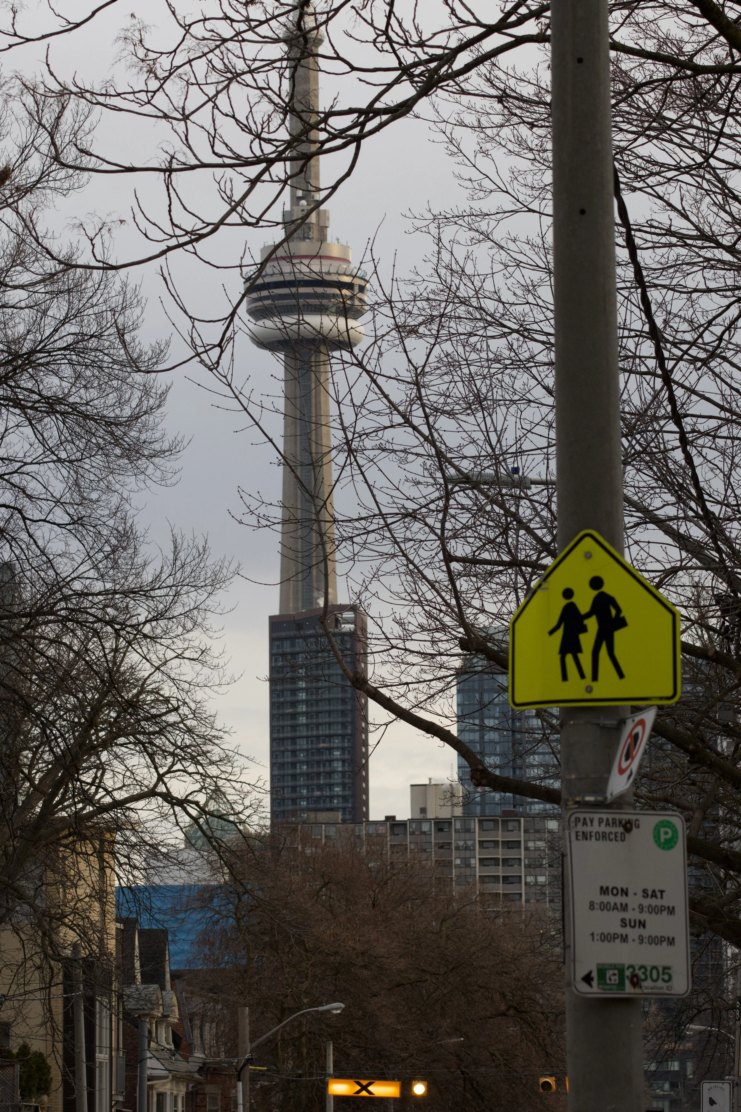 Beyond the bustle, a quieter rhythm emerges. The iconic CN Tower rises through a frame of bare branches, its steel presence softened by the simplicity of suburban streets. Signs of everyday life punctuate the horizon, grounding the city's ambition in moments of pause and familiarity.